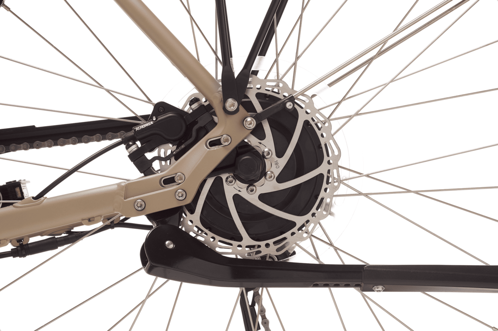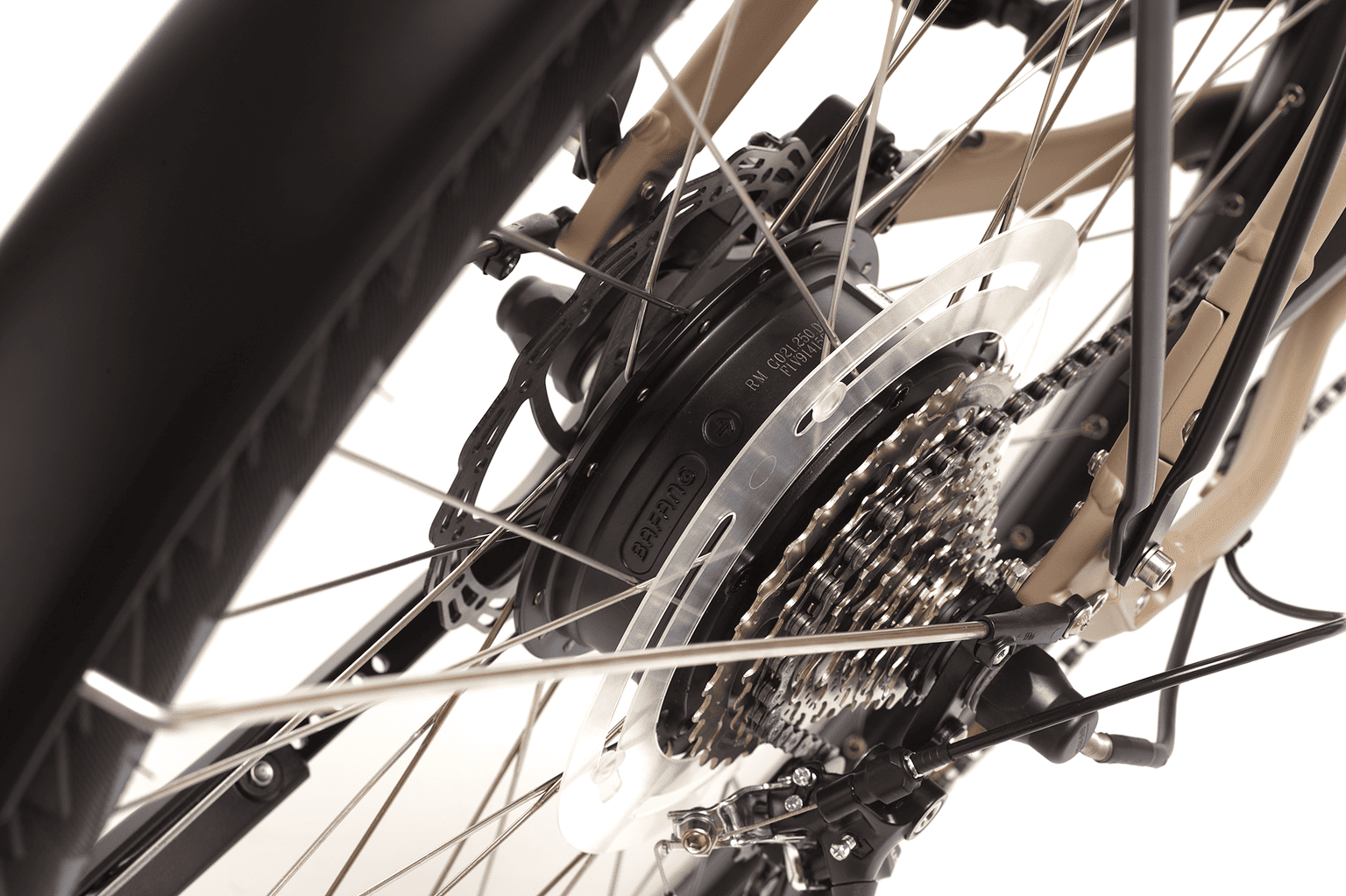 Sitting in the back wheel, tucked away behind the cassete, it allows a good weight distribution and enough power for your daily commutes.
